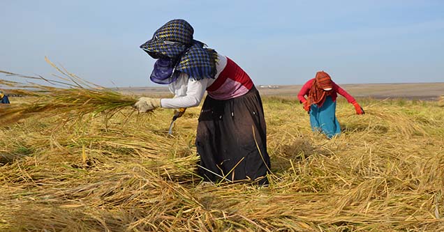 Şanlıurfa’nın Siverek ilçesinde çeltik hasadının başlamasıyla tarlaya giden çok sayıda kadın günlük 30 lira yevmiye ile çalışıyor.