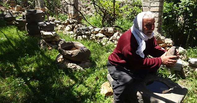 İlçenin Karakeçi Mahallesi’nde oturan Mahmut Karageçili (67) geniş bir avlusu bulunan evinin bahçesini karataştan yapılmış el değirmeni, sıkma taşı, soku, dibek gibi eski taş aletleri bulunduruyor.