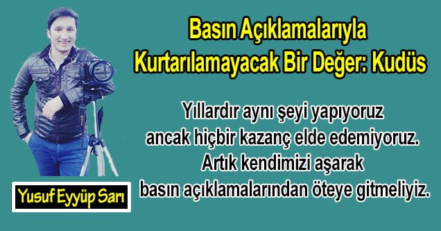 Yıllardır aynı şeyi yapıyoruz ancak hiçbir kazanç elde edemiyoruz. Kudüs’te Müslümanlar öldürülür, basın açıklaması yaparız, Mescid-i Aksa ibadete kapatılır ama biz yine slogan atmaktan başka bir şey yapmayız. Hep merak etmişimdir basın açıklamasını düzenlemek ilk kimin aklına geldi. Artık kendimizi aşarak basın açıklamalarından öteye gitmeliyiz. Bu öteye gitmekten kastım ne tam olarak ben de bilmiyorum ama kendimden emin bir şekilde söyleyebilirim ki ‘Basın açıklamalarıyla Kudüs’ü kurtaramayacağız.’