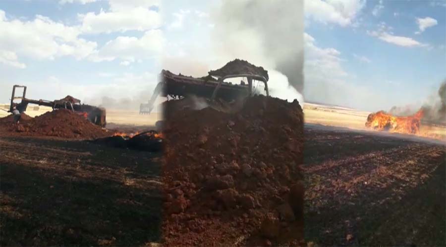 Şanlıurfa’nın Siverek ilçesinde kırsalında meydana gelen anız yangını ortasında kalan iş makinesi küle döndü.