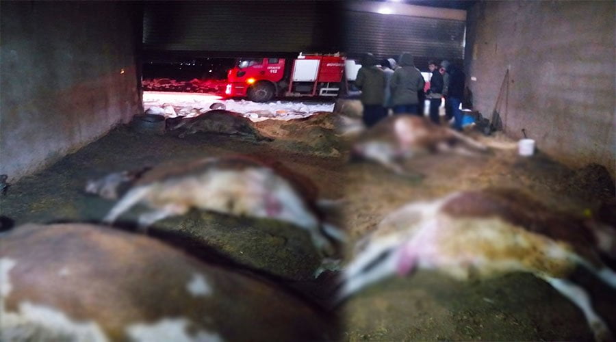 Evin yanındaki ahırda bulunan 5 büyükbaş hayvan ise sızan dumandan zehirlenerek telef oldu.