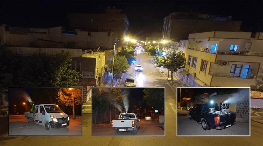 Akşam saatlerinde müdürlük şantiyesinde araç bakımları ile ilaç hazırlama sürecini tamamlayan gece ekipleri, mesai mefhumu gözetmeden tüm sokakları dolaşarak gece geç saatlere kadar ilaçlama yapıyor.