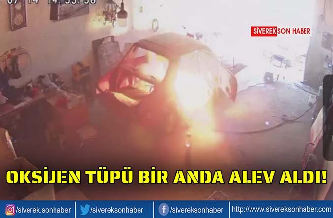 Oksijen tüpünün alev alması ve iş yerinde yaşananlar ise anbean güvenlik kamerasına yansıdı.