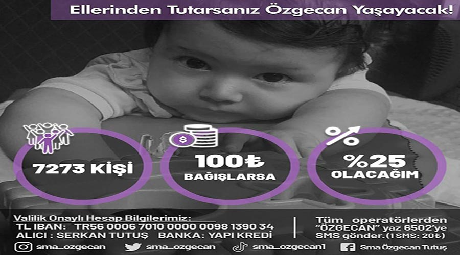 Tutuş ailesi, SMA tip 1 kas hastalığına yakalanan Özgecan bebeğin yaşama tutunabilmesi için ellerinden gelen her şeyi yapıyor ancak 2,5 yaşına gelen bebeğin yaşama tutunması, yurt dışındaki gen tedavisinde kullanılan ve fiyatı yaklaşık 2 milyon dolar olan SMA ilacının alınması ile mümkün olacak.