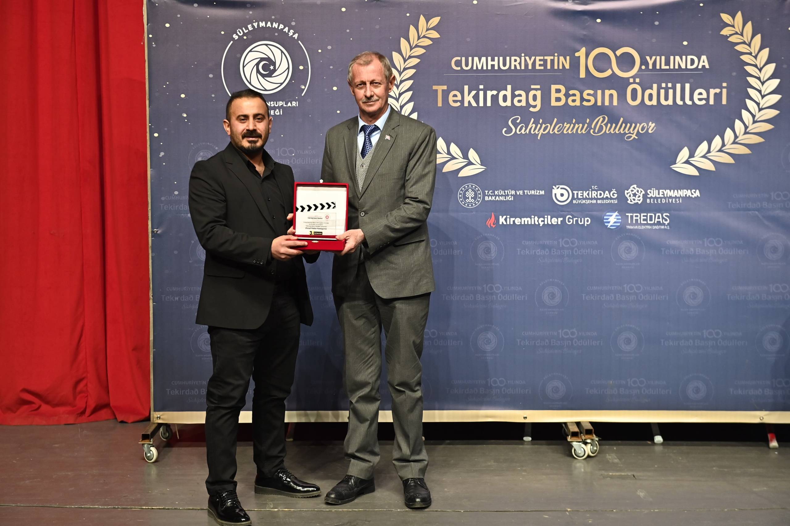 Siverekli Muhabir Halil Dağ, ödülünü Süleymanpaşa Belediye Başkanı Hüseyin Uzunlar’dan aldı.