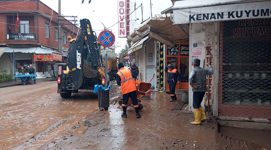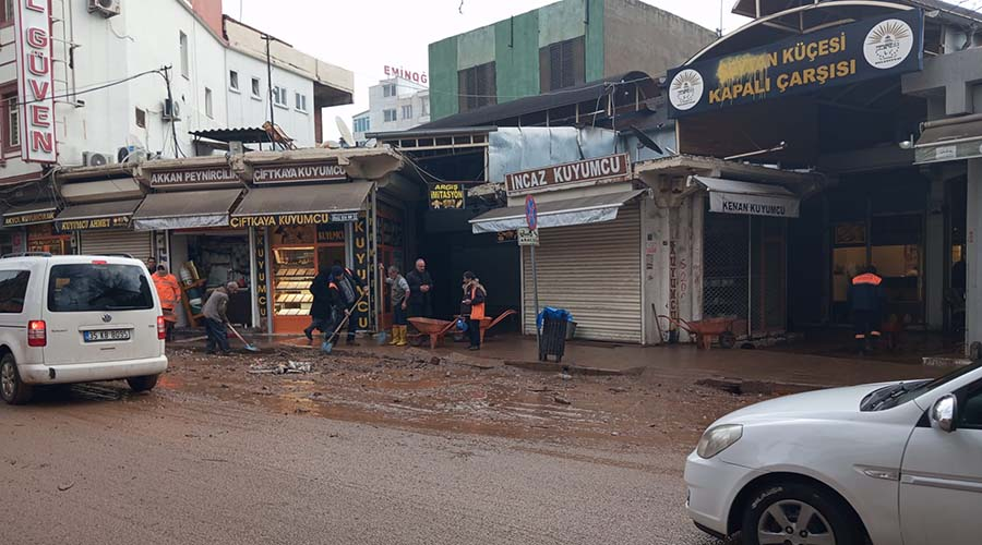 Zarar gören iş yerlerini de temizleyen ekipler, cadde ve sokakları suyla yıkamayı sürdürüyor.
