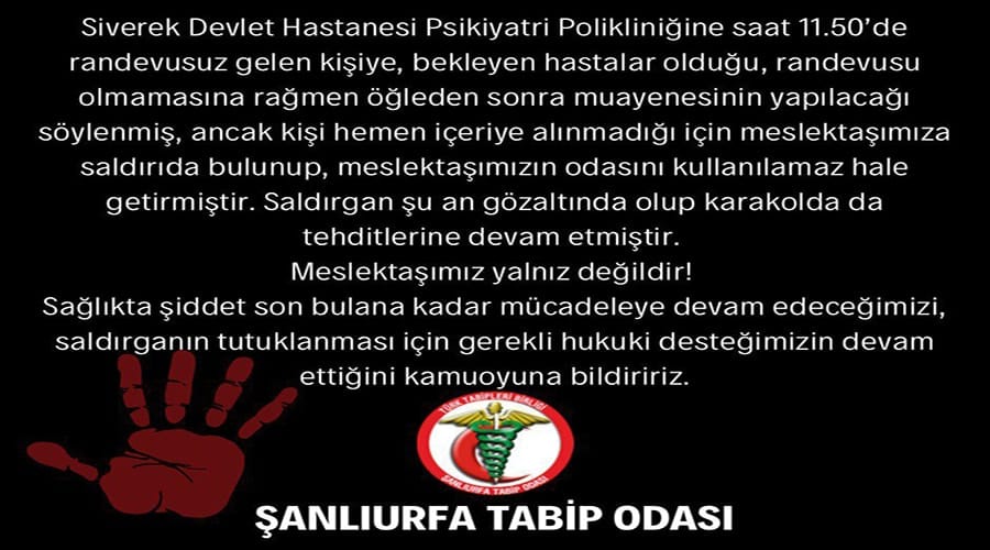 Şanlıurfa Tabip Odası tarafından konuyla ilgili yapılan açıklamada şu ifadelere yer verildi: “Siverek Devlet Hastanesi Psikiyatri polikliniğine saat 11.50’de randevusuz gelen kişiye, bekleyen hastalar olduğu, randevusu olmamasına rağmen öğleden sonra muayenesinin yapılacağı söylenmiş ancak kişi hemen içeriye alınmadığı için meslektaşımıza saldırıya bulunup, meslektaşımızın odasını kullanılamaz hale getirmiştir. Saldırgan şu an gözaltında olup karakolda da tehditlerine devam etmiştir. Meslektaşımız yalnız değildir! Sağlıkta şiddet son bulana kadar mücadeleye devam edeceğimizi, saldırganın tutuklanması için gerekli hukuki desteğimizin devam ettiğini kamuoyuna bildiririz.”