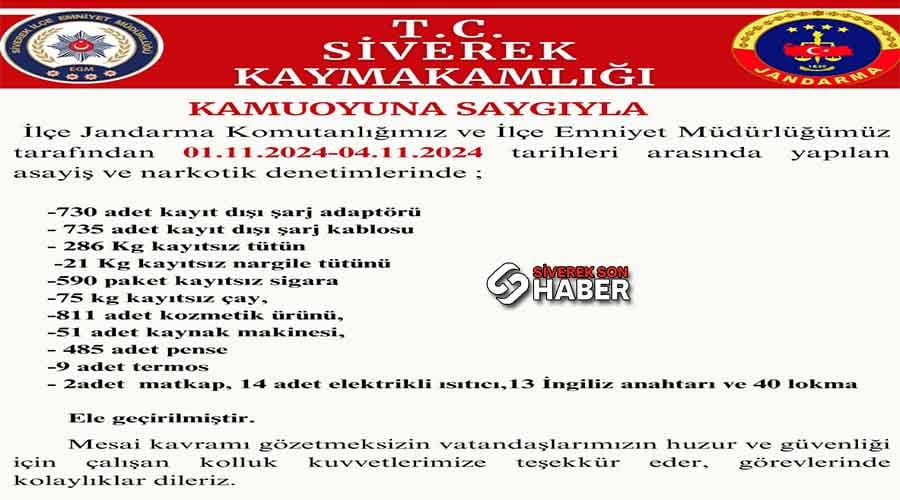 Denetimler kapsamında yapılan aramalarda, kayıt dışı olduğu belirlenen 730 şarj adaptörü, 735 şarj kablosu, 286 kilogram tütün, 21 kilogram nargile tütünü, 590 paket sigara, 75 kilo çay, 811 kozmetik ürünü, 51 kaynak makinesi, 485 pense, 9 termos, 2 matkap, 14 elektrikli ısıtıcı, 13 ingiliz anahtarı ile 40 lokma ele geçirildi.