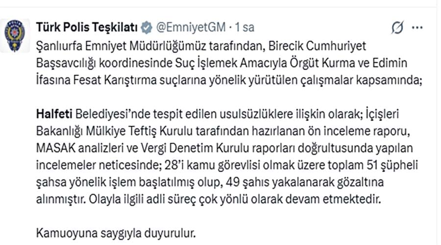 Haber: Cuma Sarı – Şanlıurfa’nın Halfeti ilçesinde belediyeye yönelik düzenlenen şafak operasyonunda, aralarında eski belediye başkanı Şeref Albayrak’ın da bulunduğu 49 kişi gözaltına alındı.